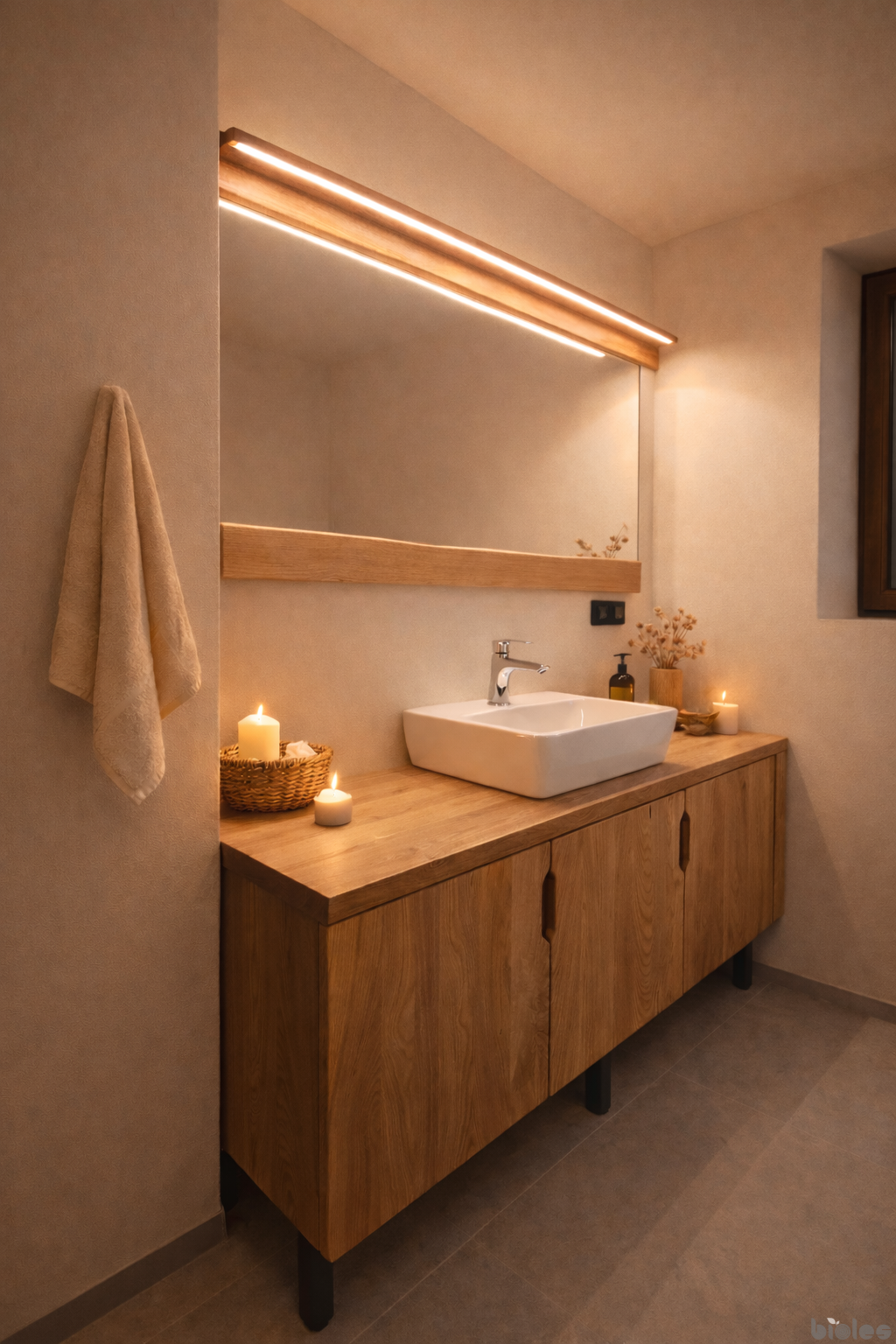 Kupaonicu upotpunjuje veliko ogledalo s okvirom od masivnog drva, opremljeno elegantnom LED rasvjetom koja se uključuje pokretom ruke. Posebna prednost ovog elementa je prirodan, jedinstven rub drvenog okvira, koji kupaonici daje toplinu, ekskluzivnost i prestižan izgled.