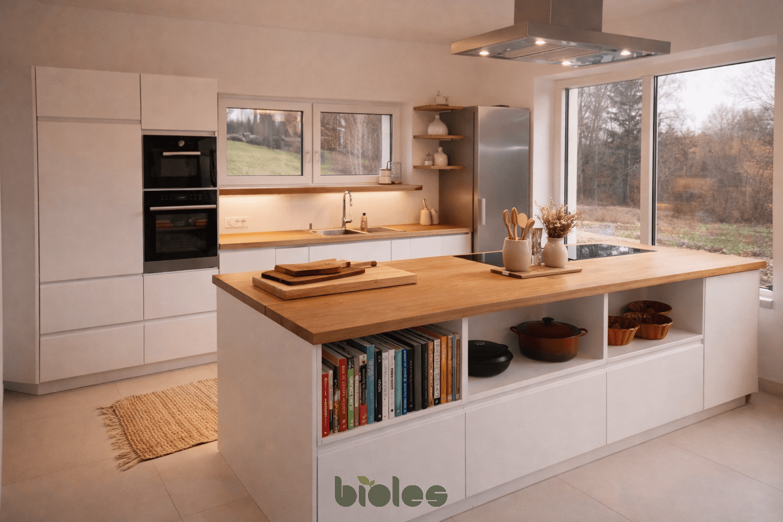 Masivne hrastove radne ploče donose čvrstoću, trajnost i izraženu prirodnu strukturu, dok bijele fronte prostoru daju svjetlinu, čistoću i bezvremenski izgled. Rezultat je kuhinja koja je funkcionalna, elegantna i ugodna za svakodnevnu uporabu.