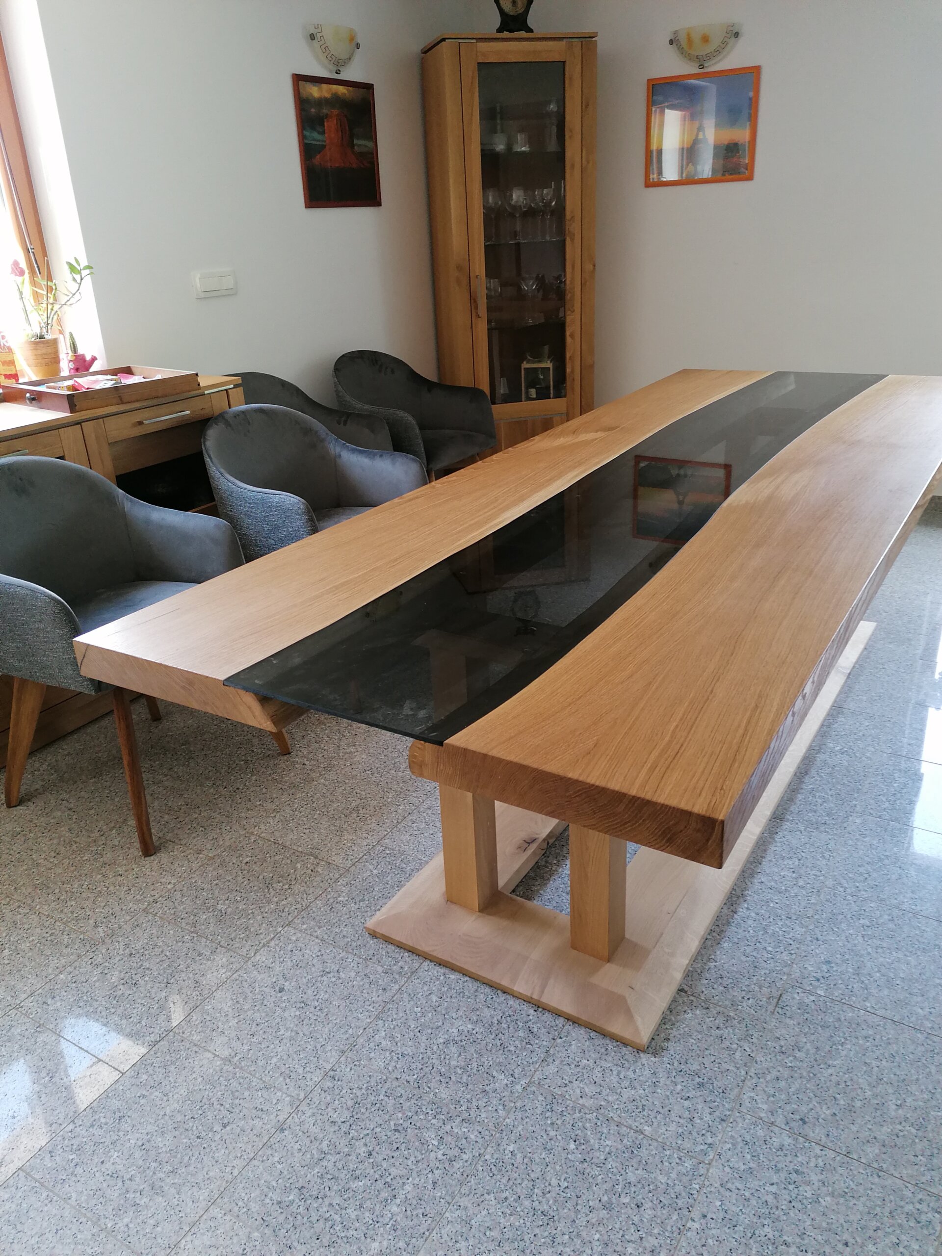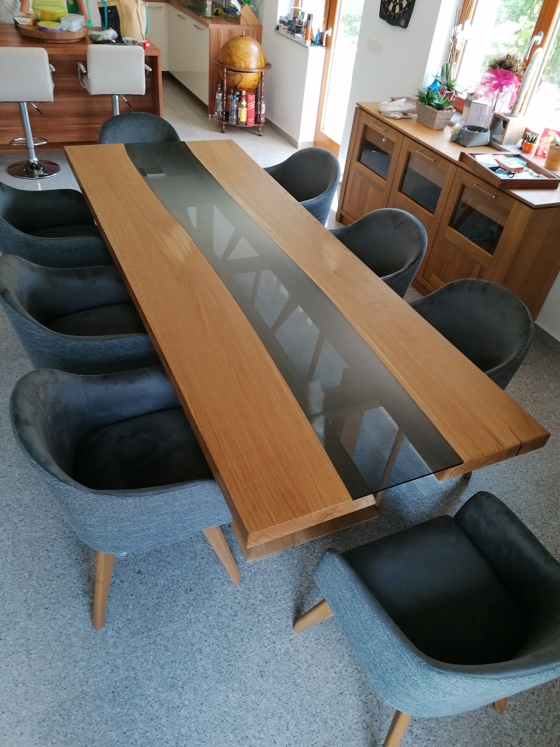 Unikatni hrastov stol s kaljenim staklom – savršena harmonija prirode i modernog dizajna