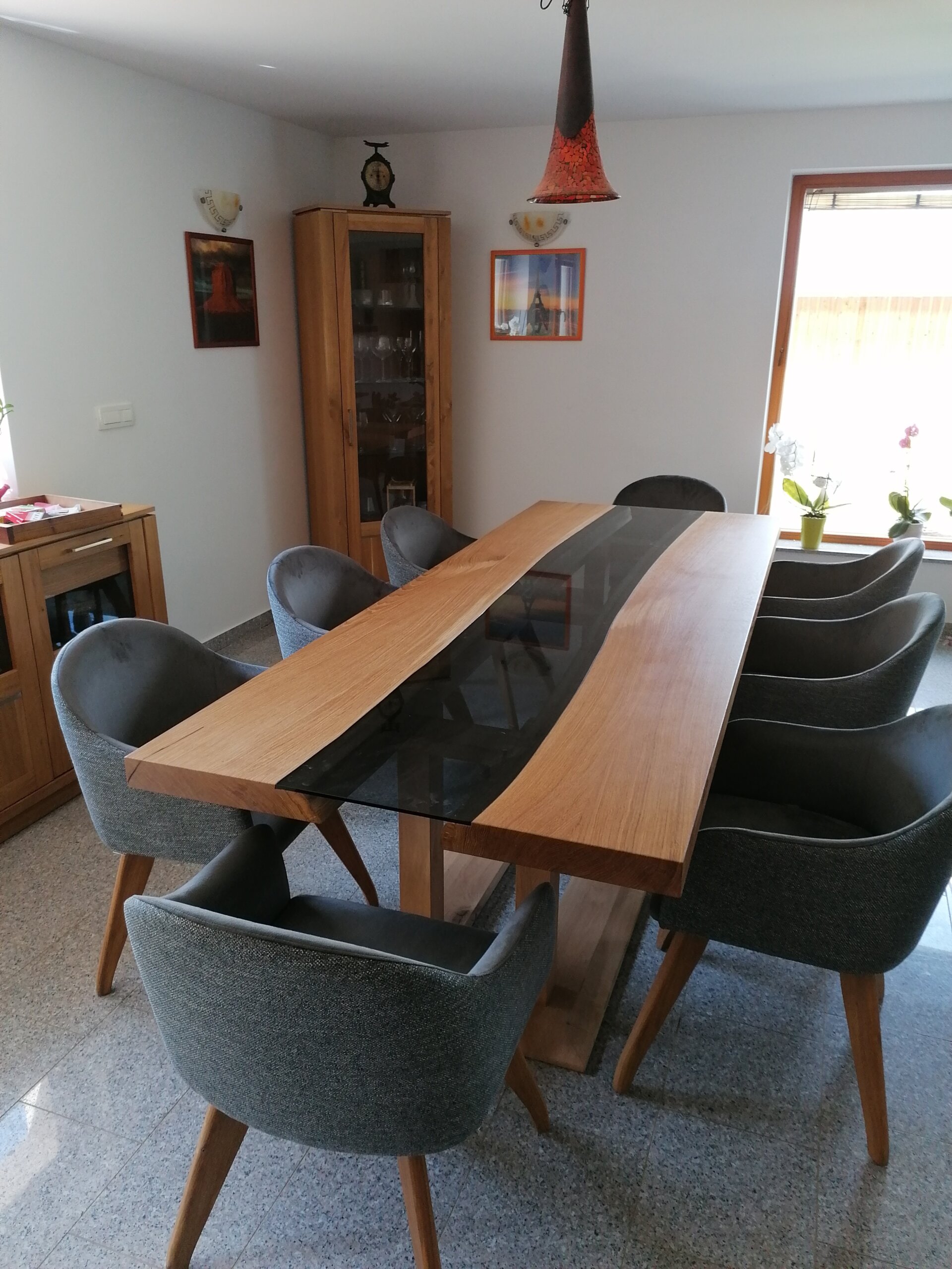 Središnji dio stola krasi kaljeno staklo, precizno izrezano prema prirodnoj liniji hrasta. Upravo zato je svaki stol potpuno unikatan – nikad dvije iste linije, nikad dva ista komada.